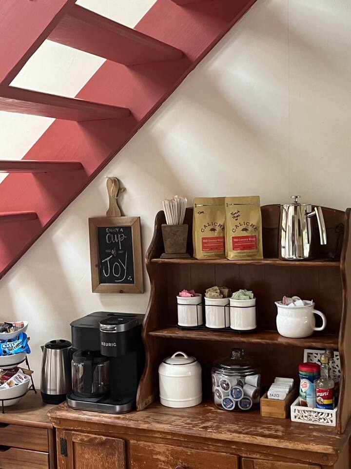 Whatever brings you to the Texas Hill Country, you will enjoy the charm of the unique cottage layout of The Red Stair Haus. Four King Suites with private en-suites (2 downstairs & 2 upstairs), open-plan living, and a spacious screened-in porch make this home perfect for a couple's getaway, girls' trip, weekend getaway, or mid-week escape. Book your stay today and experience the ultimate relaxation at our charming retreat! or add us to your favorites list for a future visit. A 15% trip discount for stays of 4 days or longer (applied at checkout). The kitchenette has cooking basics, including an induction burner, air fryer/toaster oven, microwave, toaster, dishwasher, full-size refrigerator, beverage fridge, dishware/flatware, slow cooker, and outdoor gas BBQ Grill with side burner. Note: No stove/Oven. Coffee klatsch with Keurig, drip coffee maker, and French Press provided. Complimentary light snacks & drinks are provided to kick-start your stay. Bathrooms are furnished with bath and body products to elevate your bathing experience and include hair dryers and luxury towels. Four spacious king-bed suites with private en-suites offering luxurious linens. Two bedrooms upstairs and two downstairs. Open plan living room: Gas fireplace (seasonally available Oct-Apr), ample seating, and Smart-TV (ROKU with Guest Sign-in). Outdoor Living: The screened-in Porch, ceiling fans, dining table, and patio furniture make this space ideal for morning coffee and evening hors d'oeuvres. The grounds are immaculate, earthy & secluded with a fire-pit sitting area perfect for enjoying the beautiful evenings. Please read the other details to note the section below. Parking: Onsite parking for 4+ vehicles with additional street parking. Veteran Owned and Operated We're here to help! Please inquire and let's start planning your perfect stay. Permit Number:8056001559